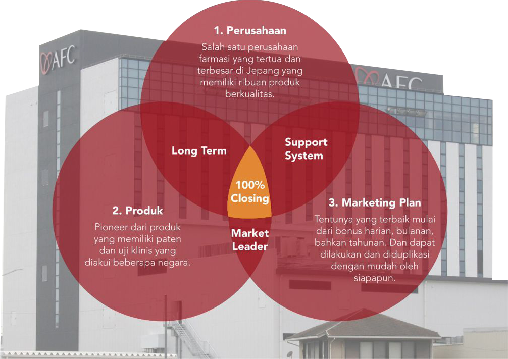 AFC Life Science merupakan distributor resmi dari AFC Jepang hadir di Indonesia sebagai perusahaan Direct Selling terbesar dan terpercaya di Indonesia. Komitmen kami bagi Indonesia menyediakan All Natural Supplement dengan kualitas terbaik dengan bahan bahan anti aging super premium yang sudah mendapatkan patent, teruji secara klinis dan penghargaan Internasional dengan Marketing Plan terbaik di Indonesia saat ini. Berikut ini alasan mengapa AFC Life Science menjadi pilihan yang tepat untuk membantu kesehatan dan kesejahteraan kita semua.